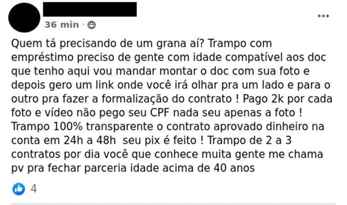 Existem grupos em redes sociais em que a oferta de “aluguel” destas contas é abertamente divulgada e negociada (Imagem 3).