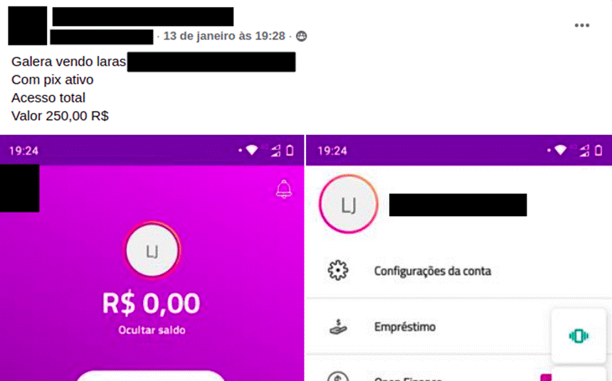 Um ponto importante para a monetização dos golpes financeiros aplicados por estelionatários é onde receber o valor transferido pelas vítimas, sejam elas pessoas que estão tentando adquirir algum produto ou serviço, ou pessoas que estejam sofrendo extorsão mediante sequestro relâmpago, conhecido, atualmente, como ‘golpe do Amor’ ou ‘sequestro do Pix’. Nesse cenário, entra o uso das contas correntes digitais de “laranjas” ou apenas “lara” (Imagem 1) como costumam se referir às contas abertas em nome de terceiros.