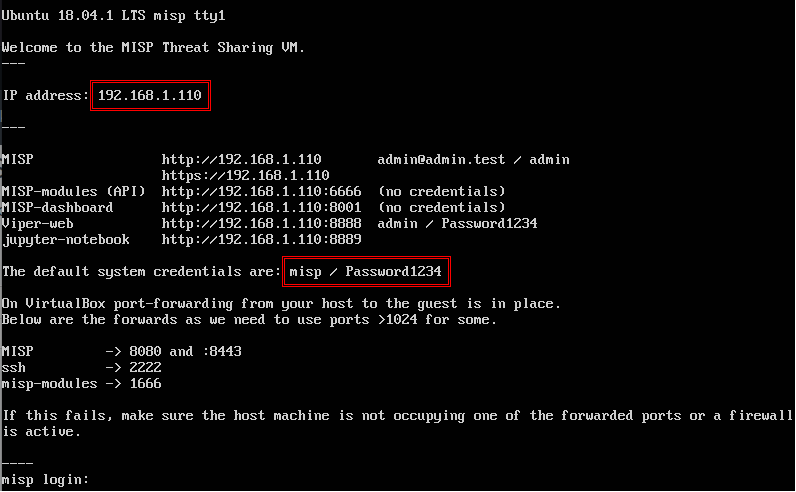 Figure 2 – MISP initialized with network in bridge mode using the local network IP.
