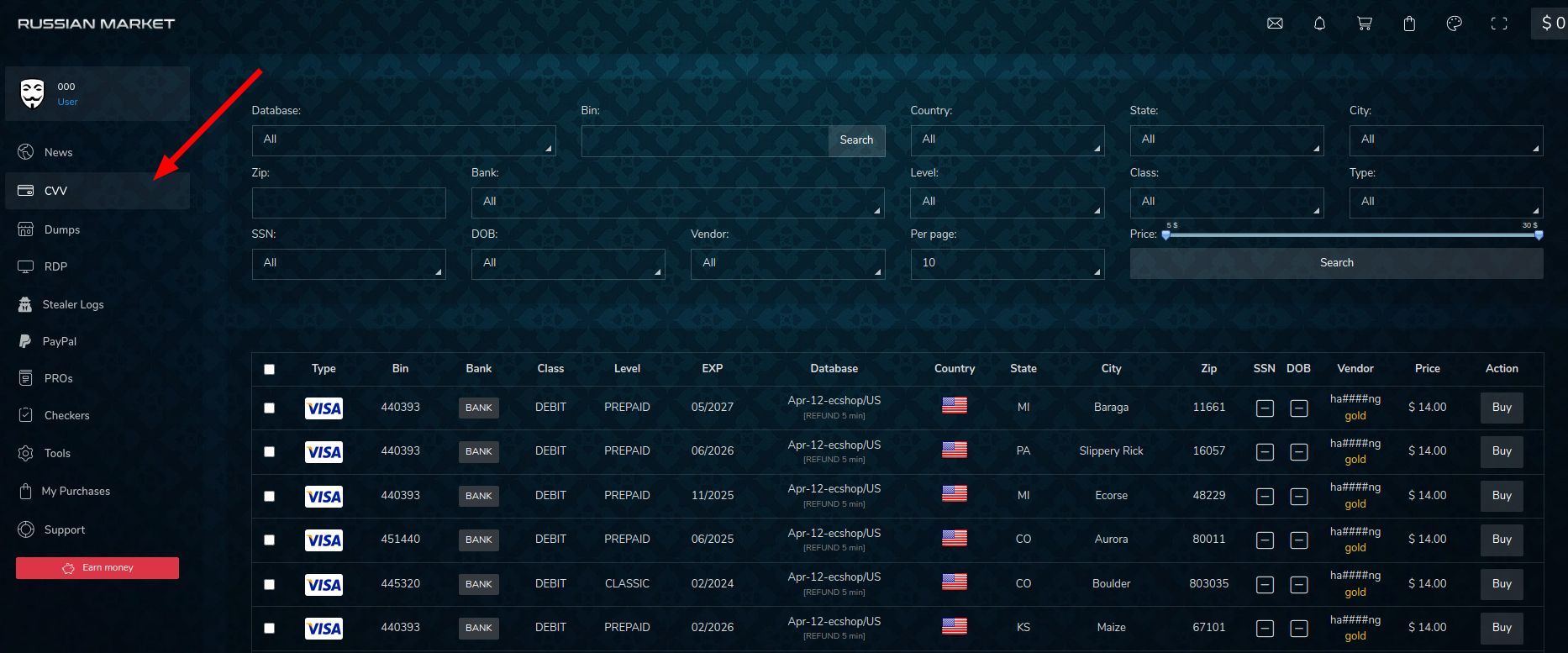 - Flea Market: free section containing remote access, logs, emails, exploits, database, documents etc;