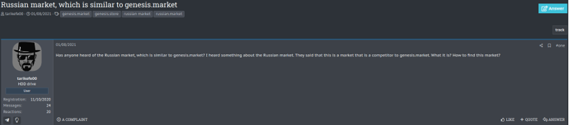 We haven’t identified any announcements or recommendations related to Russian Market in any of the main underground forums: XSS, ExploitIN and RAMP. However, according to the registration date of the store’s main domain, we believe that the marketplace exists since 2019. Despite little information about Russian Market, the marketplace is mentioned in a tweet by cybersecurity researcher Brian Krebs as one of the sources used by LAPSUS$ to purchase access. In a post on the XSS forum, Russian Market is pointed to as a possible alternative to the Genesis Store. Despite this, we have identified some criticism of the store under claims that the logs provided are not first hand.