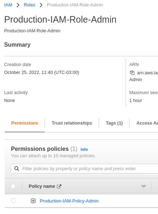 Then, the Role Production-IAM-Role-Admin is created and the policy Production-IAM- Policy-Admin is attached.