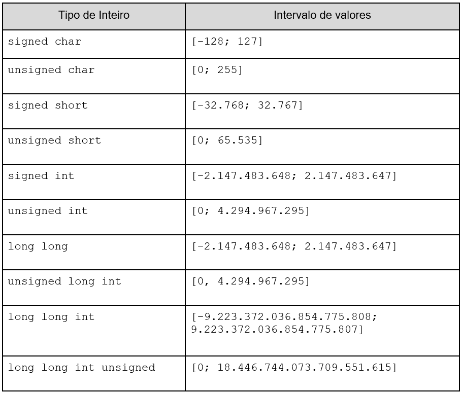 Além disso, cabe ao compilador prover os valores máximos e mínimos. Desse modo, vejamos na tabela abaixo, todos os tipos de inteiros com seus respectivos valores atribuídos, bem como a caracterização quanto ao uso ou não do sinal negativo.
